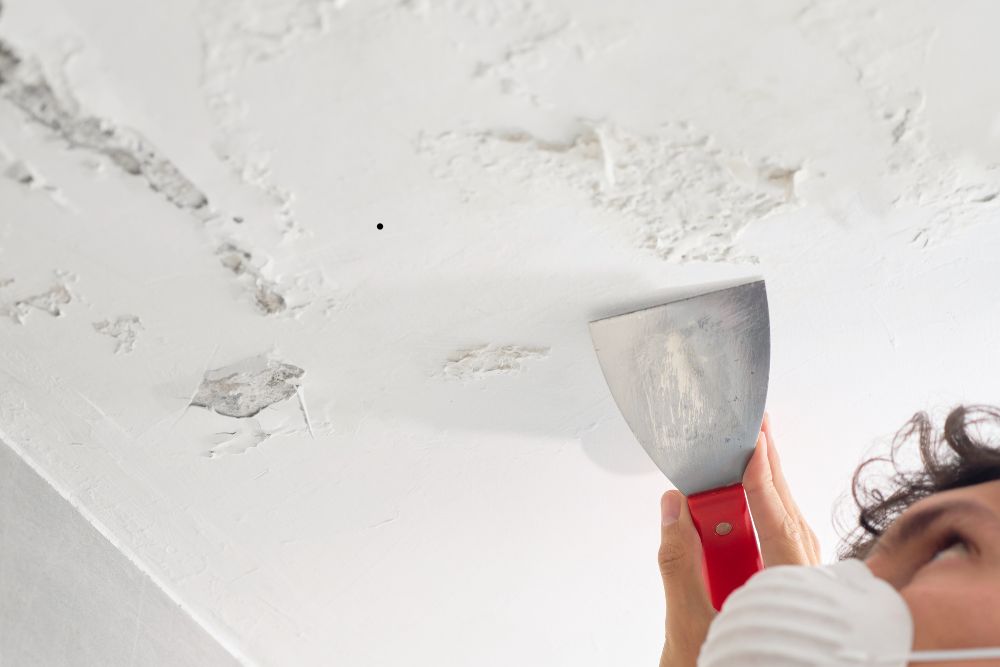 • Elimina la pintura y el yeso dañado: con una espátula, retira las zonas donde la pintura esté descascarillada. Si hay moho, limpia la superficie con una mezcla de agua y lejía o un producto específico.