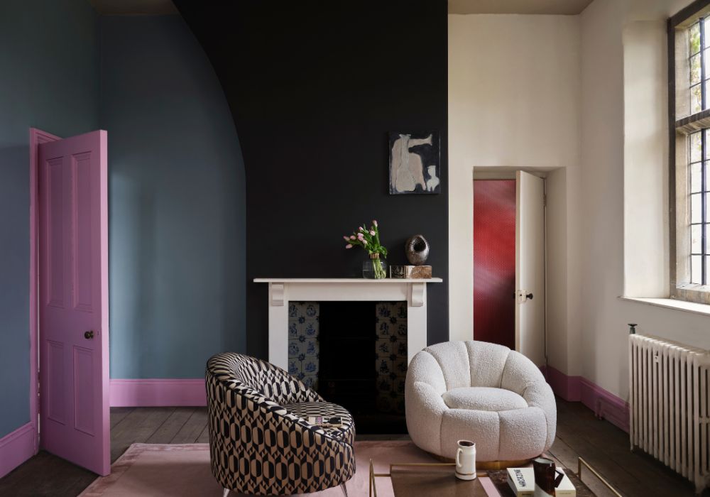 Emplear tonos de la misma familia de color permite lograr un efecto sofisticado y armonioso. Las paredes en un tono claro, como gris o azul, puede contrastar con un tono ligeramente más oscuro en los zócarlos, creando así una atmósfera elegante y unificada. Es tendencia el colour drench para un diseño de interiores cohesivo e impactante; consiste en usar los mismos colores en diferentes intensidades en un mismo espacio. Aquí puedes ver cómo lo usan los expertos en color de FarroW &Ball.