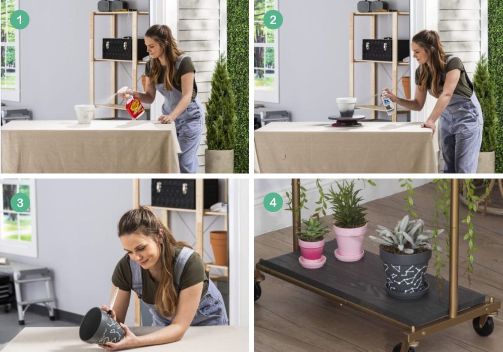 En cuatro colores diferentes, la pintura de acabado texturizado de Rust-Oleum permite obtener diferentes efectos, desde hierro envejecido hasta arena del desierto. Muy recomendable para pintar macetas de barro que se quieran ubicar en un ambiente rústico o natural.